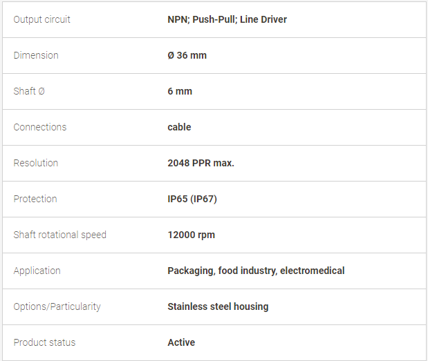MI36K Encoders-Lika Vietnam. Bộ mã hóa vòng quay này là thiết bị phản hồi, đo lường vị trí và tốc độ trên một thiết bị hoặc trên toàn hệ thống máy móc. Chúng được sử dụng phổ biến nhất là đo lường chuyển động thẳng hoặc chuyển động quay trong một bộ điều khiển hệ vòng kín hoặc hở của một hệ điều khiển tự động.